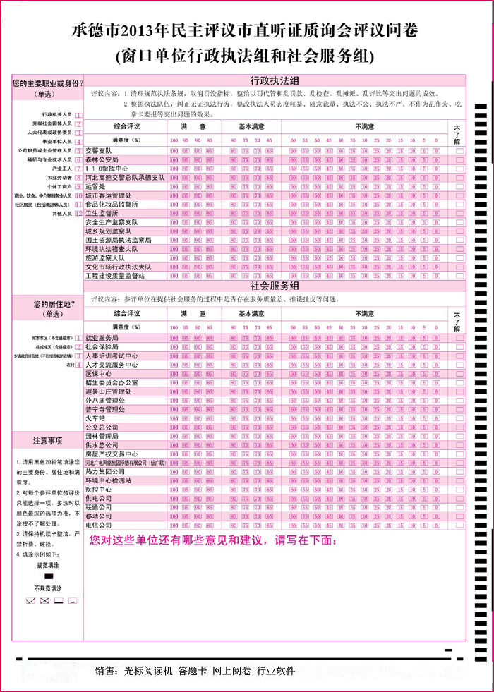 我公司對(duì)各種招聘,閱卷,考核活動(dòng)都有專用機(jī)器和軟件配套使用,光標(biāo)閱讀機(jī)租賃和閱卷機(jī)租賃。公司供應(yīng)各種高端型號(hào)國(guó)內(nèi)大、中、小學(xué)標(biāo)準(zhǔn)化考試,教學(xué)評(píng)估、學(xué)籍管理等光標(biāo)閱讀機(jī)以及各種客戶端的網(wǎng)上閱卷系統(tǒng)。我公司擁有眾多經(jīng)驗(yàn)豐富的軟、硬網(wǎng)絡(luò)工程師,可以為您提供完整的基于WINDOWSNT、NETWARE及INTERNET/INTRANET的網(wǎng)絡(luò)方案,歡迎垂詢,歡迎選購(gòu)。同時(shí)也向廣大用戶提供配套的信息卡設(shè)計(jì)及高質(zhì)量的印刷服務(wù),價(jià)格優(yōu)惠。產(chǎn)品售出后,免費(fèi)保修三年,終身維護(hù)。后續(xù)應(yīng)用軟件免費(fèi)升級(jí)。適用范圍:考試閱卷,學(xué)籍管理,招生報(bào)名,教學(xué)評(píng) ,人口普查,民意,競(jìng)賽抽獎(jiǎng),納稅申報(bào),記賬憑證,調(diào)查,健康、滿意度、疾病調(diào)研,案例分析,戶籍管理服務(wù)電力系統(tǒng):干部廉正,員工考核,干部選舉,民主選舉,民主測(cè)評(píng),干部考核,換屆考察,年終考核,人事測(cè)評(píng),崗前測(cè)評(píng),市場(chǎng)問(wèn)卷,心理測(cè)試等大、中、小學(xué)標(biāo)準(zhǔn)化考試,教學(xué)評(píng)估,學(xué)籍管理等領(lǐng)域。